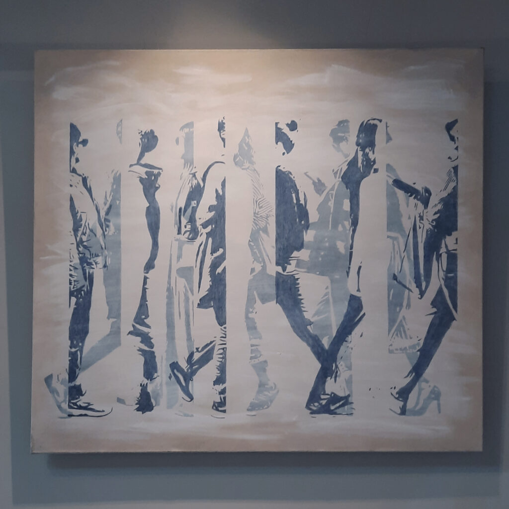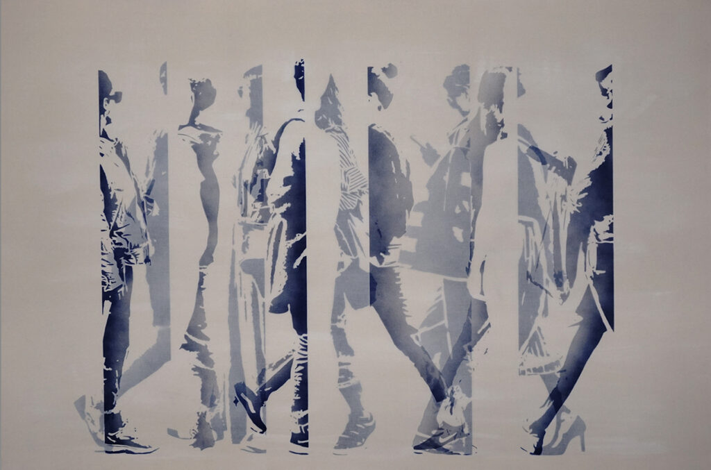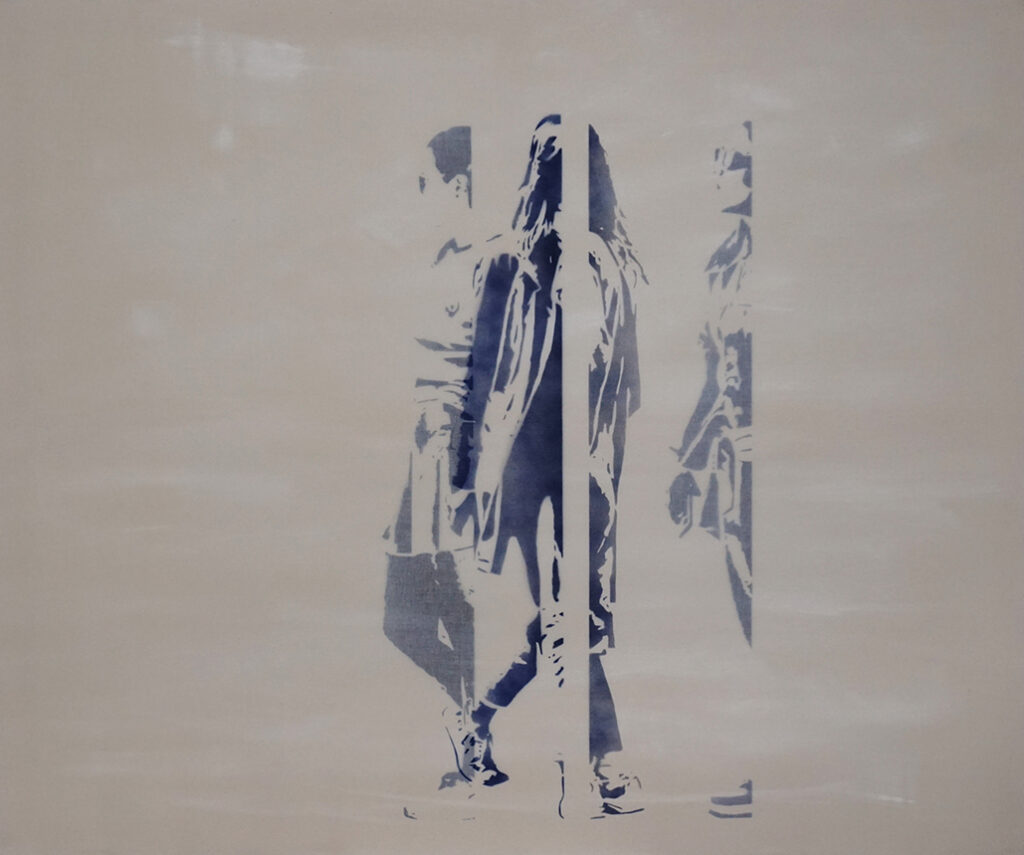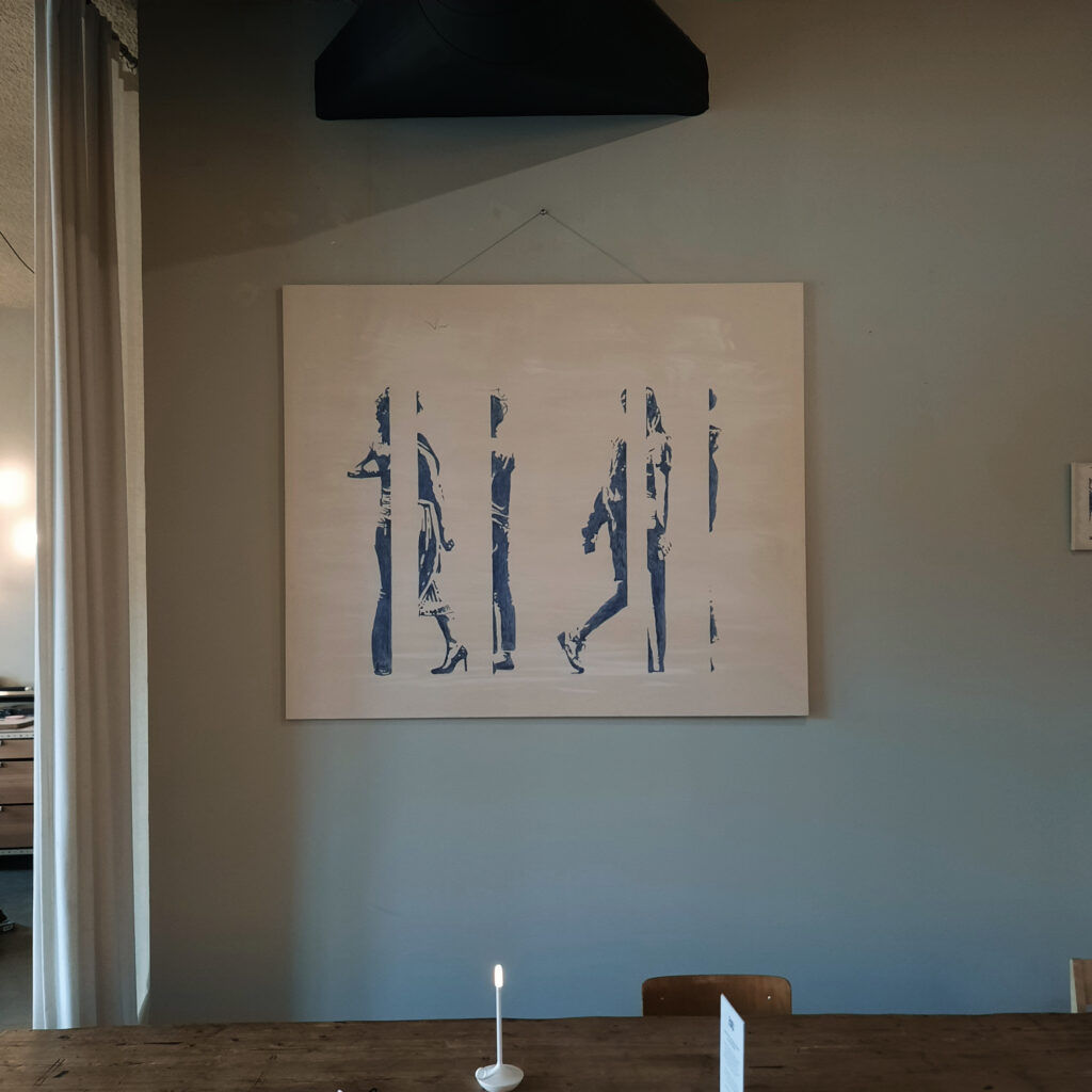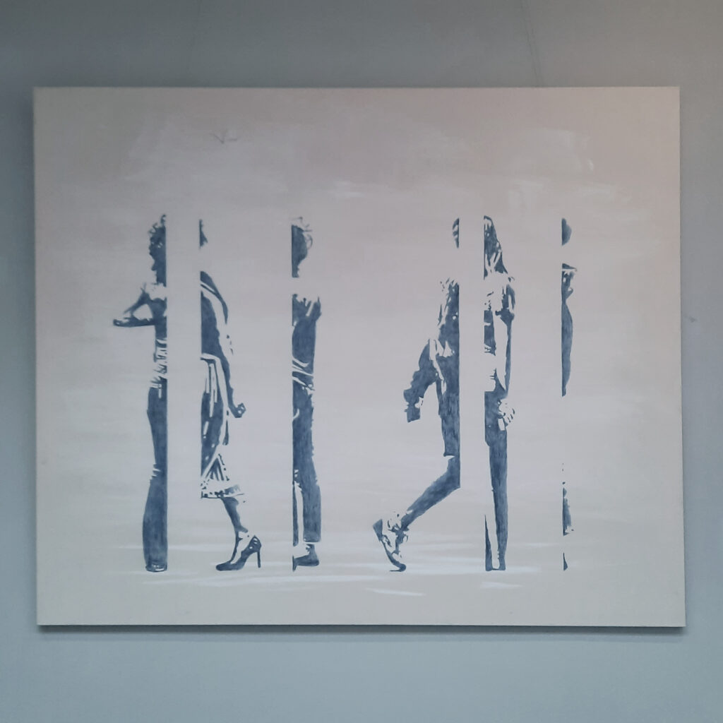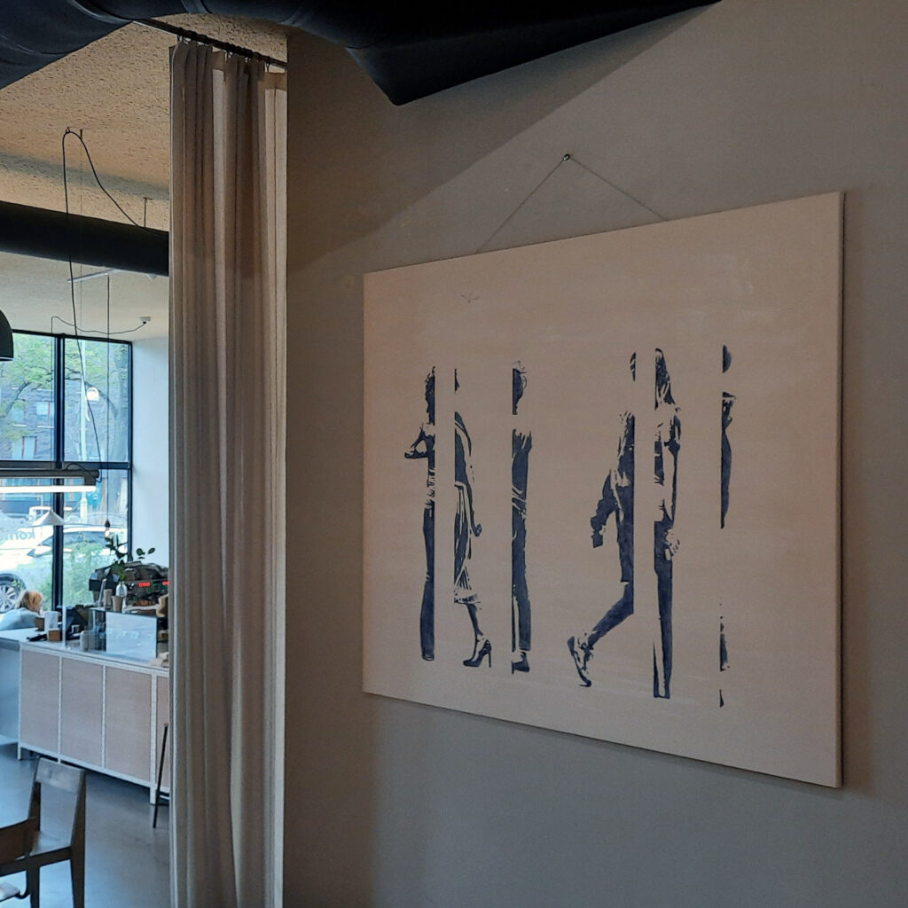 To create the triptych “Between People” she used her skills as a streetphotographer to look for body-language, light and shadows. Photographing women on the street, isolating their images from their surroundings and carefully placing them in a compositional rhythm. Of the women chosen for the painting she created 18 individual stencils and used spraypaint on double canvas to create a layered effect. Some of the women are only visible by existing as the negative space of the people around them. Many studies were made before she reached the desired effect of the triptych, which is specially made for BIG Art 2025
