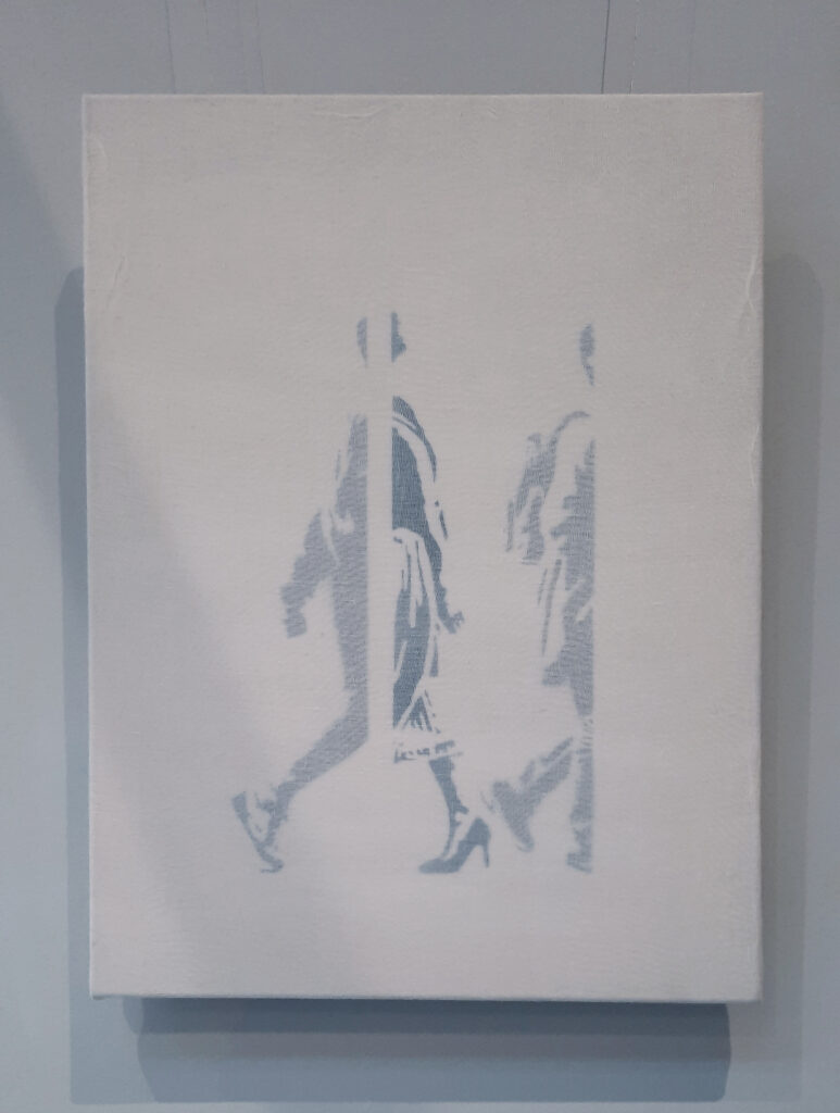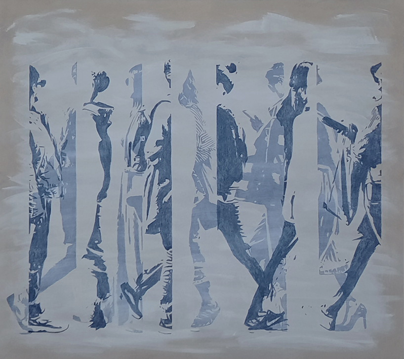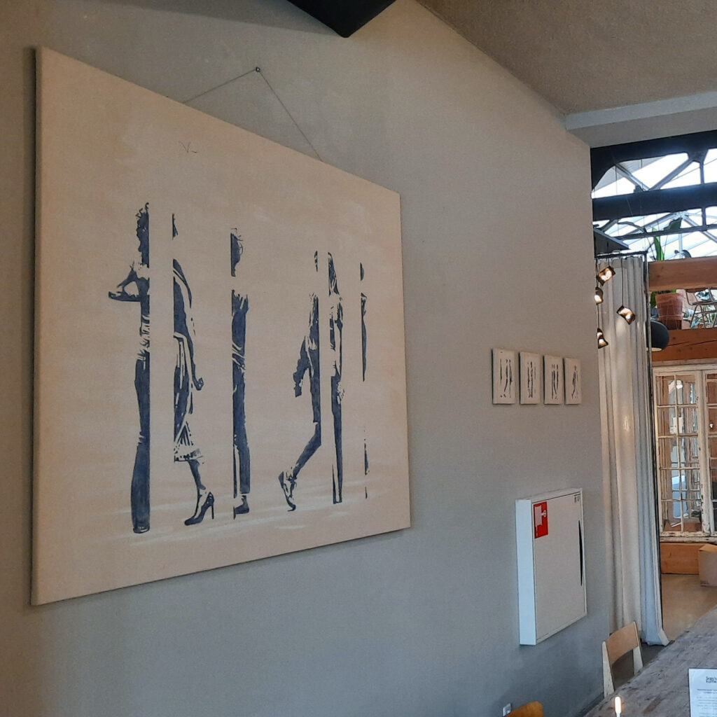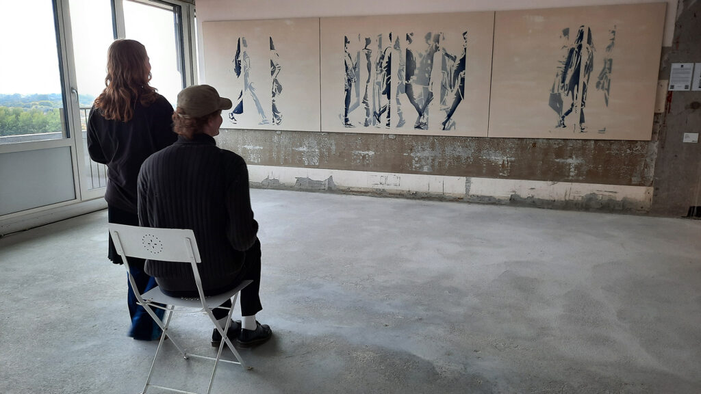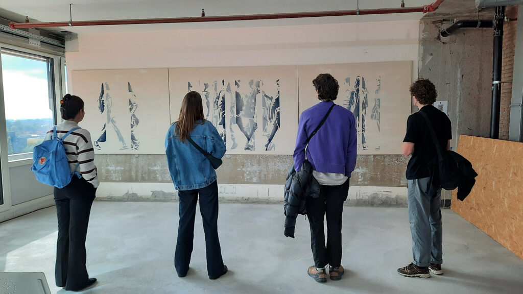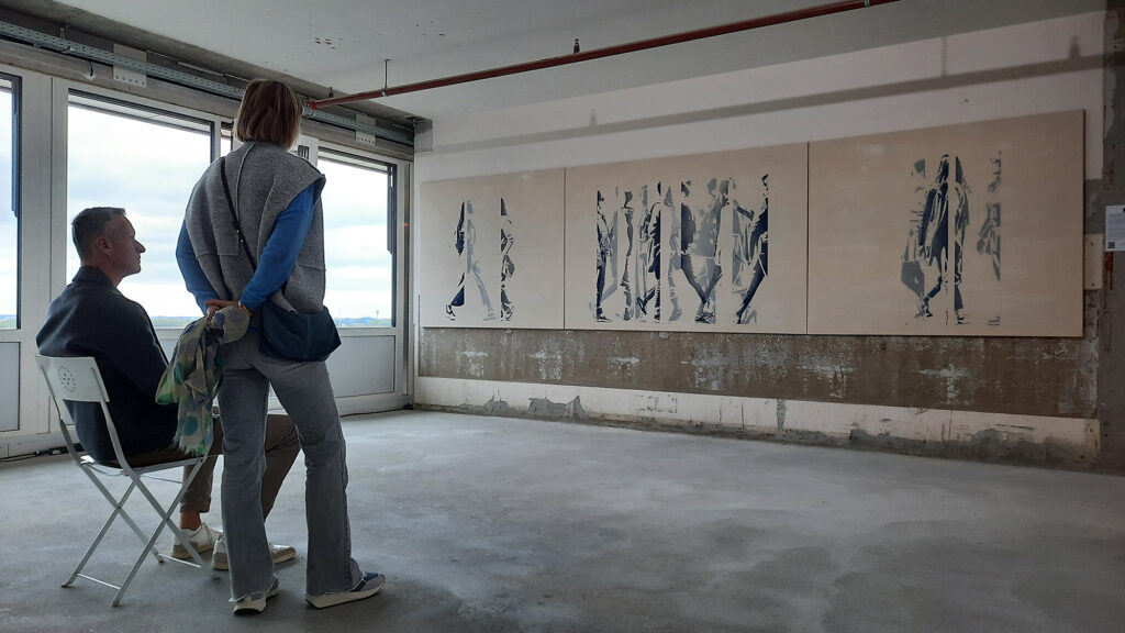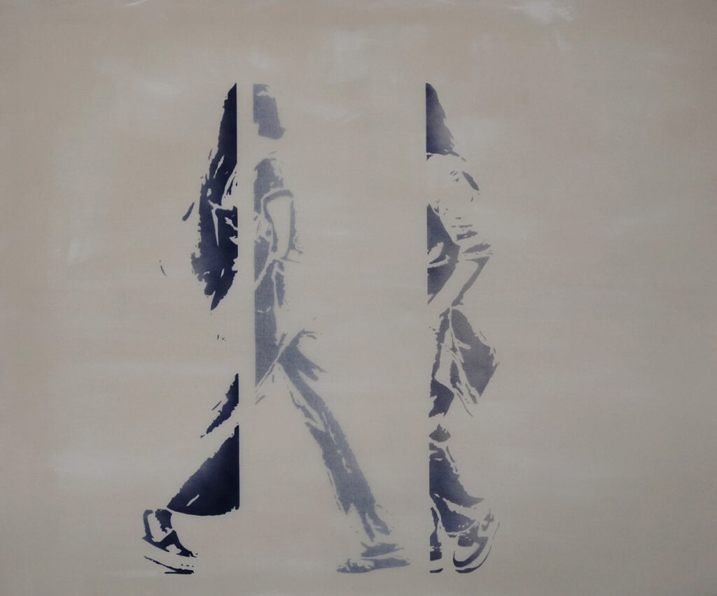 To create the triptych “Between People” she used her skills as a streetphotographer to look for body-language, light and shadows. Photographing women on the street, isolating their images from their surroundings and carefully placing them in a compositional rhythm. Of the women chosen for the painting she created 18 individual stencils and used spraypaint on double canvas to create a layered effect. Some of the women are only visible by existing as the negative space of the people around them. Many studies were made before she reached the desired effect of the triptych, which is specially made for BIG Art 2025